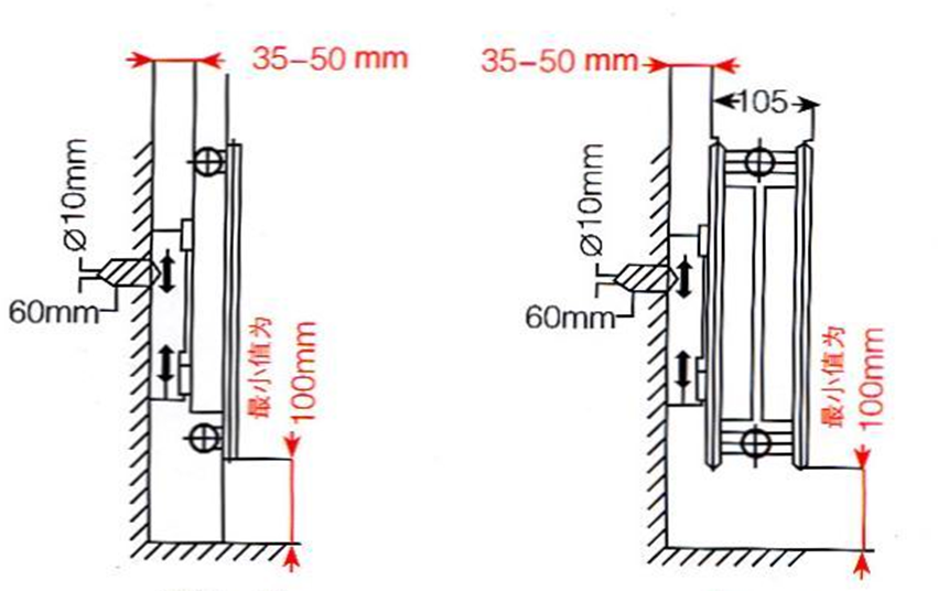 為了更好的散熱,應注意散熱器與地板以及墻體之間的距離(見圖3-5)。